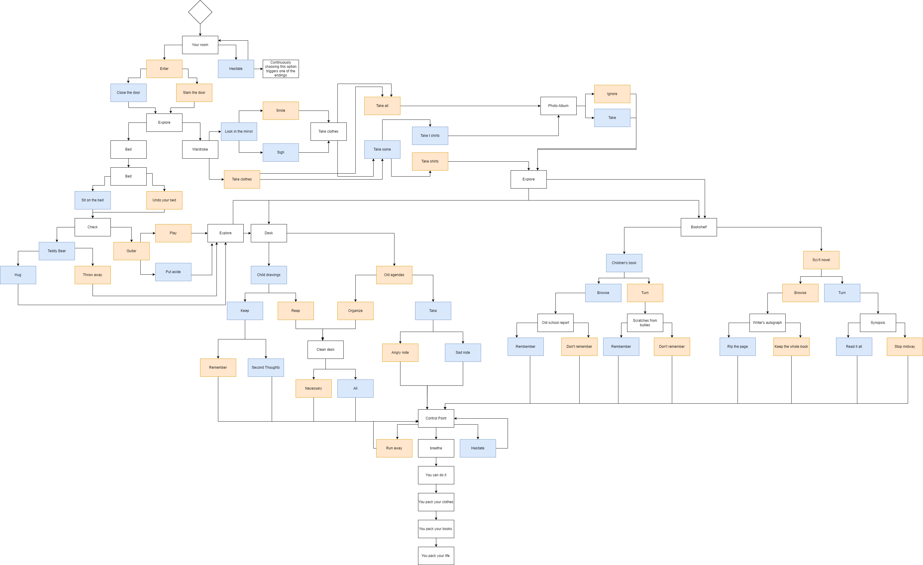 With this experience in mind, while exploring the room players are always dealt two choices that express these two feelings. Each choice is connected to a color: blue for the desire to stay, orange for the desire to start anew.